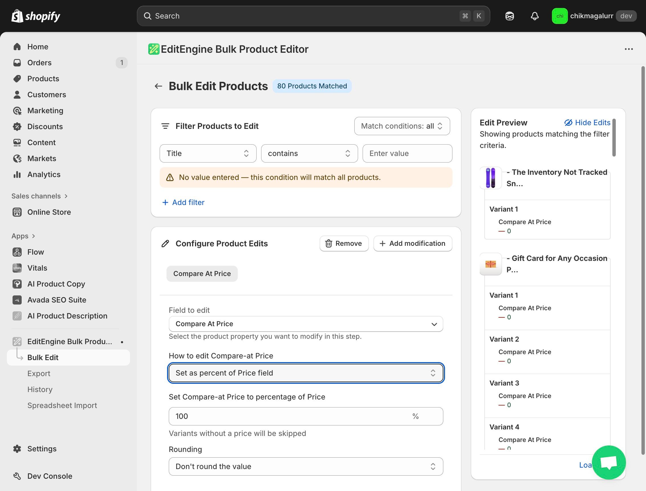 Set Compare at price relative to Price in Shopify using EditEngine